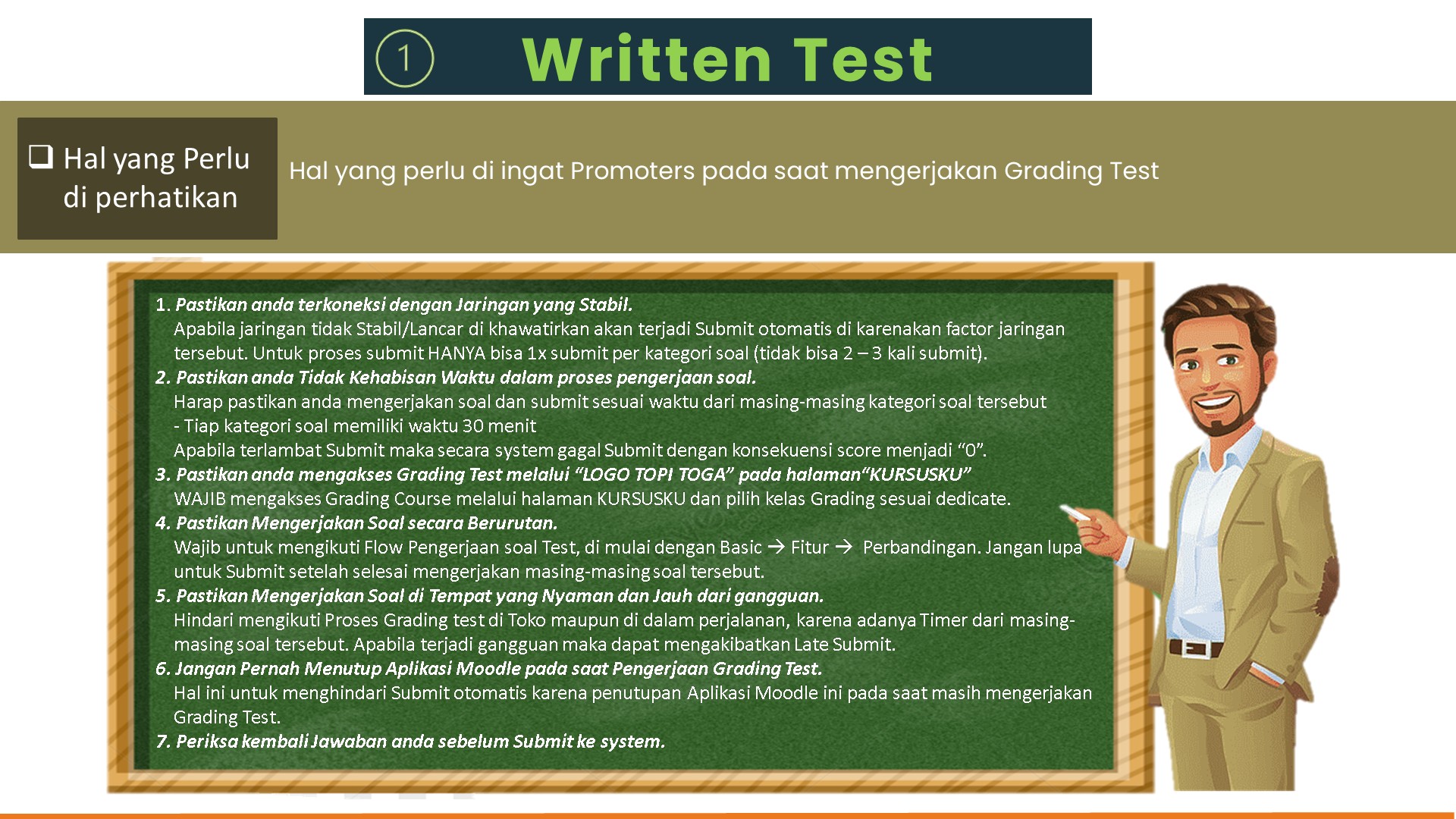 Mohon Teman-teman Promotor semua memperhatikan hal hal penting diatas untuk mencapai nilai grading yang maksimal. Jika terjadi eror sistem pada salah satu hal penting diatas maka anda harus menerima nilai sesuai dengan yang di kirim dan soal tidak dapat di ulang kembali.